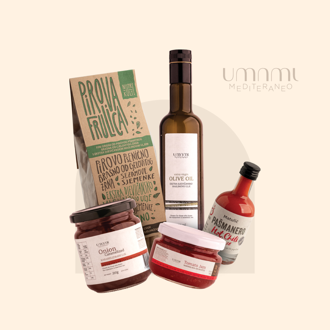 Salty umami gift package packed in black box. Includes premium olive oil 250 ml, jar of caramelized onion 210g, jar of tomato jam 140g, spicy sauce 50ml and 200g pack of salty spelt snack. Gift package dimensions 320 mm x 220 mm x 100 mm.