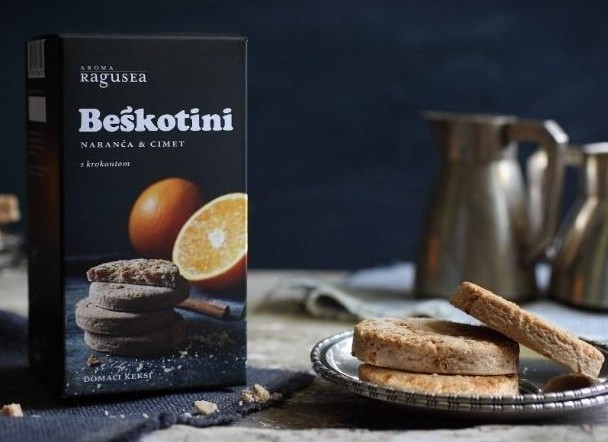 Originalni, domaći keksi obogaćeni krokantom od preprženih badema, komadićima ušećerene narančine kore i cimetom. Specifične su teksture koja spaja prhkost keksa, mekoću voća i hrskavost krokanta.