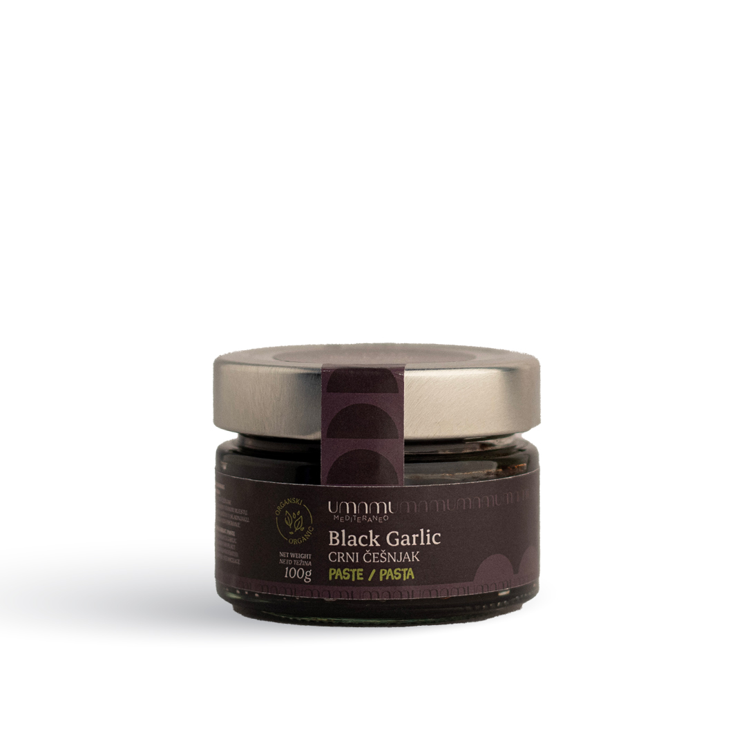Napravljen od organskog češnjaka Umami Mediteraneo crni češnjak dobiva se dugim, prirodnim procesom sazrijevanja koji kombinira temperaturu i vlažnost dulje od 40 dana. Proizvod je bez aditiva i konzervansa kako biste mogli uživati u njegovim kulinarskim svojstvima bez promjene njegovog jedinstvenog okusa i izvorne esencije. Crni češnjak nema jak okus karakterističan za svježi češnjak i ima sladak okus s glatkom teksturom. Ovo pakiranje sadrži namaz crnog češnjaka, spremno za mazanje ili dodavanje u bilo koji recept.