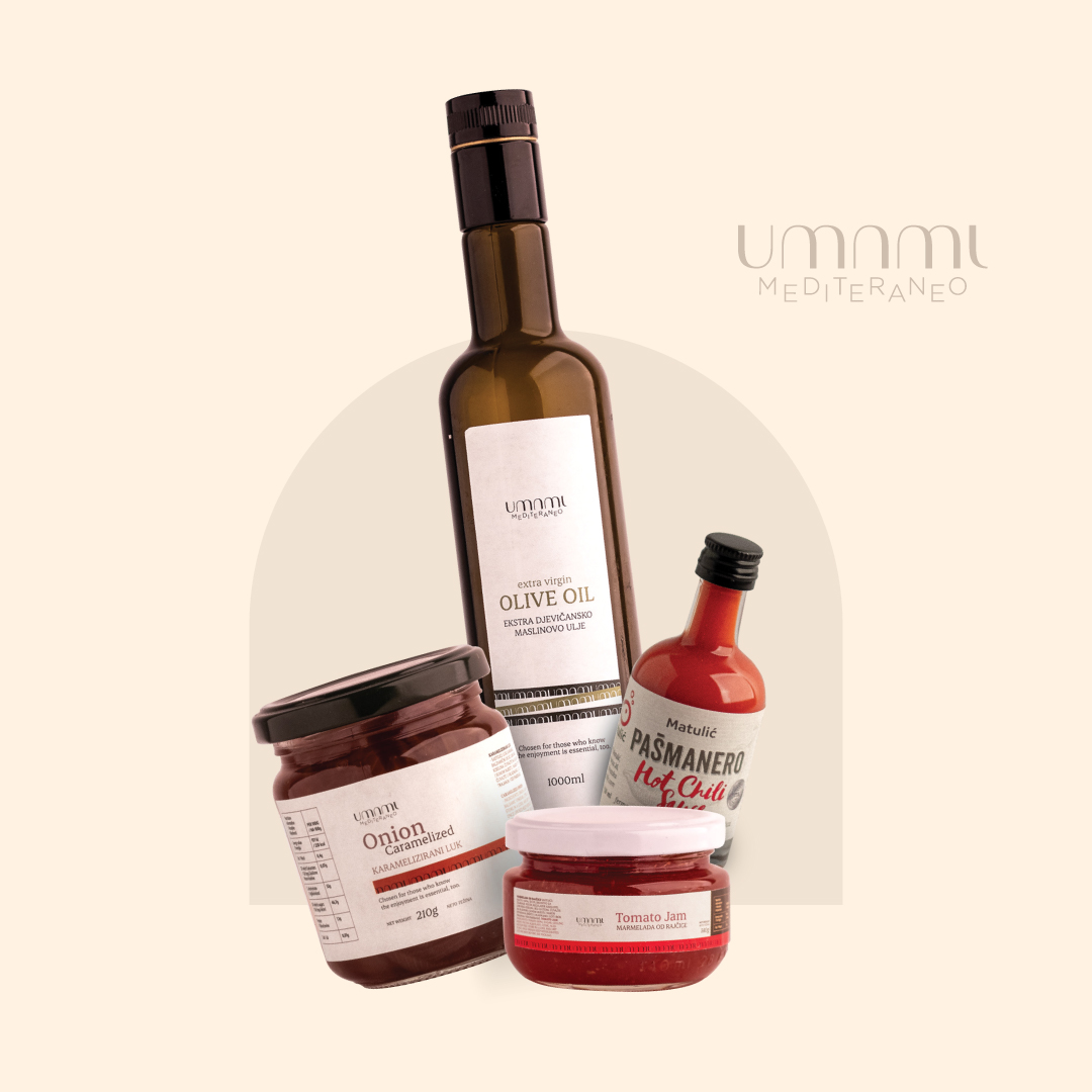 Slani umami poklon pakirani u crnu kutiju. Poklon uključuje premium maslinovo ulje od 1000 ml, teglicu džema od rajčice od 140g, teglicu karameliziranog luka od 210g i ljuti umak Pašmanero od 50ml. Dimenzija poslovnog poklona 320 mm x 220 mm x 100 mm.