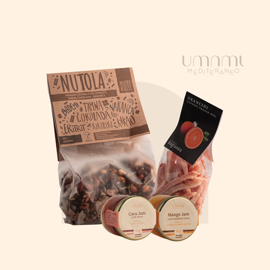 Slatki umami poklon pakiran u crnu kutiju. Poklon uključuje teglicu džema od manga 40g, teglicu od cave sa ružama 40g, pakiranje 100g arancina i 300g čoko nutola. Dimenzija poslovnog pakiranja 220 mm x 220 mm x 100 mm.